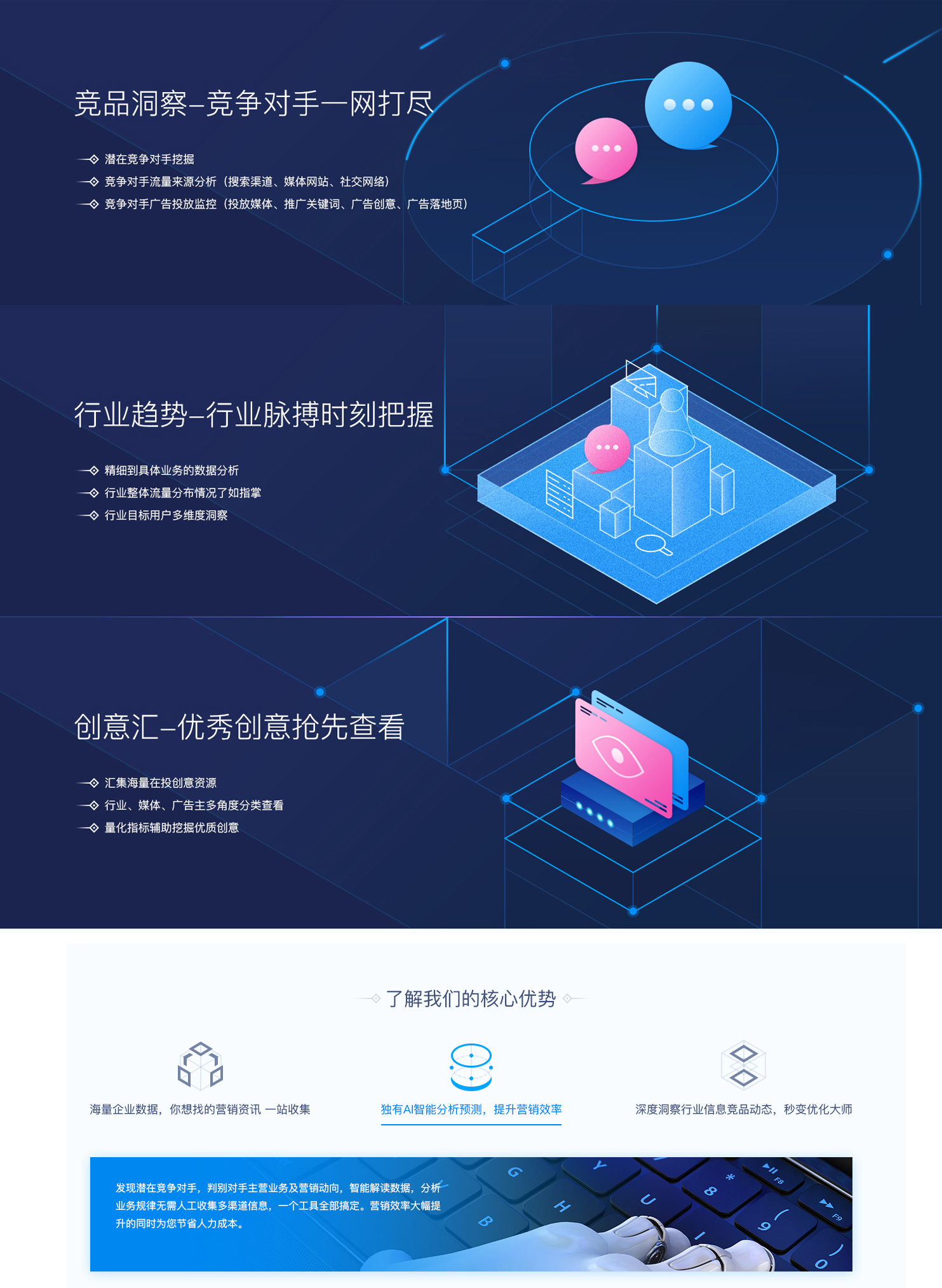 行業(yè)趨勢-行業(yè)脈搏時刻把握;精細(xì)到具體業(yè)務(wù)的數(shù)據(jù)分析;行業(yè)整體流量分布情況了如指掌行業(yè)目標(biāo)用戶多維度洞察