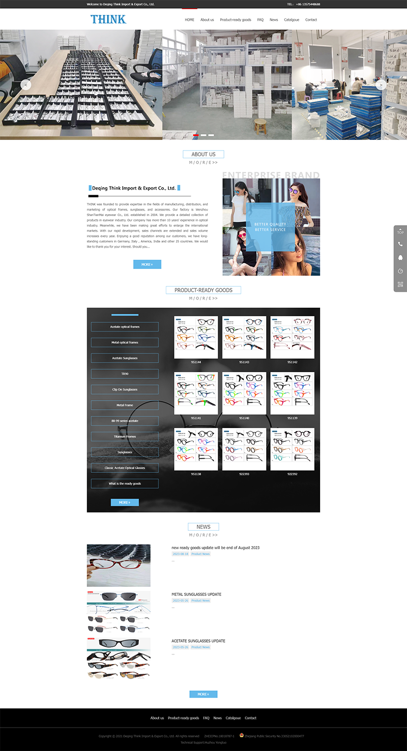 THINK was founded to provide expertise in the fields of manufacturing, distribution, and marketing of optical frames, sunglasses, and accessories. Our factory is Wenzhou ShanTianMai eyewear Co., Ltd. established in 2004. We provide a detailed collection of products in eyewear industry.